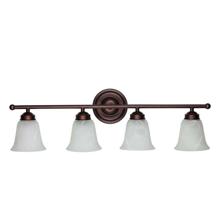 Illuminate your bathroom with the elegant and stylish 33" Matte Bronze Vanity, featuring four medium sockets and White Swirl Glass diffusers that create a warm and inviting glow.