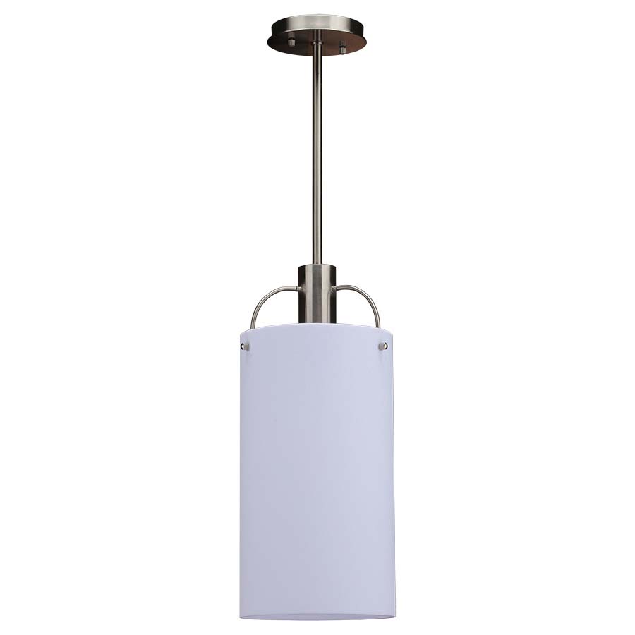 28" OAH Brushed Nickel Ceiling Pendant, with 7"Diameter x13"H Frosted White Acrylic Cylinder Shade. One GU24 socket. Recommend one 1100 lumen LED bulb.