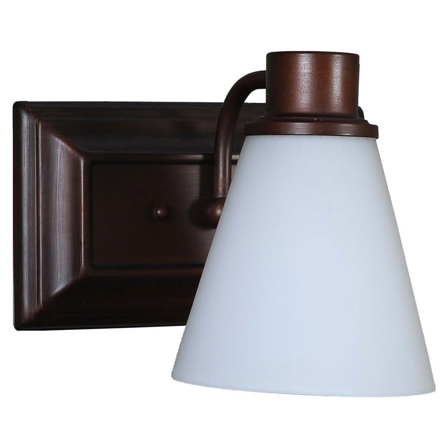 One light Matte Bronze Vanity with cone shaped White Frosted Glass diffuse, one medium base socket, Direct Wired. Recommend 800 lumen LED bulb. 8"W, 6.5"H, 6.5"D