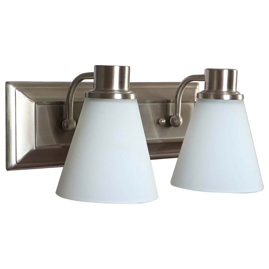Two light Brushed Nickel Vanity with cone shaped White Frosted Glass diffusers, two medium base sockets, Direct Wired. Recommend two 800 lumen LED bulbs. 14"W, 6.5"H, 6.5"D