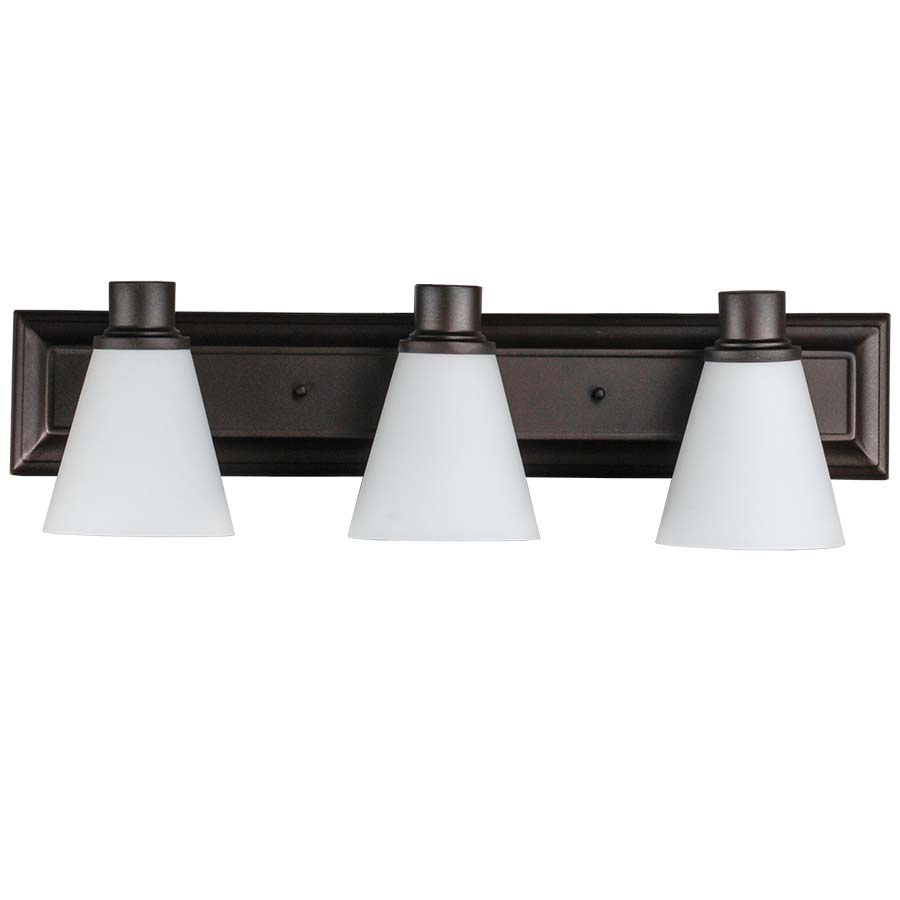 Bring a warm, sophisticated feel to your bathroom with our three-light matte bronze vanity fixture. Featuring cone-shaped white frosted glass diffusers, this fixture is direct wired and comes with three medium base sockets.