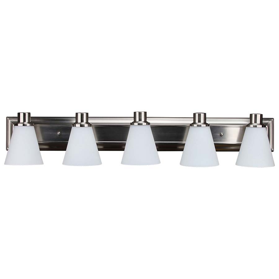 Transform your bathroom into a bright and inviting space with our five light Brushed Nickel Vanity fixture. This sleek fixture features cone shaped White Frosted Glass diffusers are sure to make a statement in your bathroom.