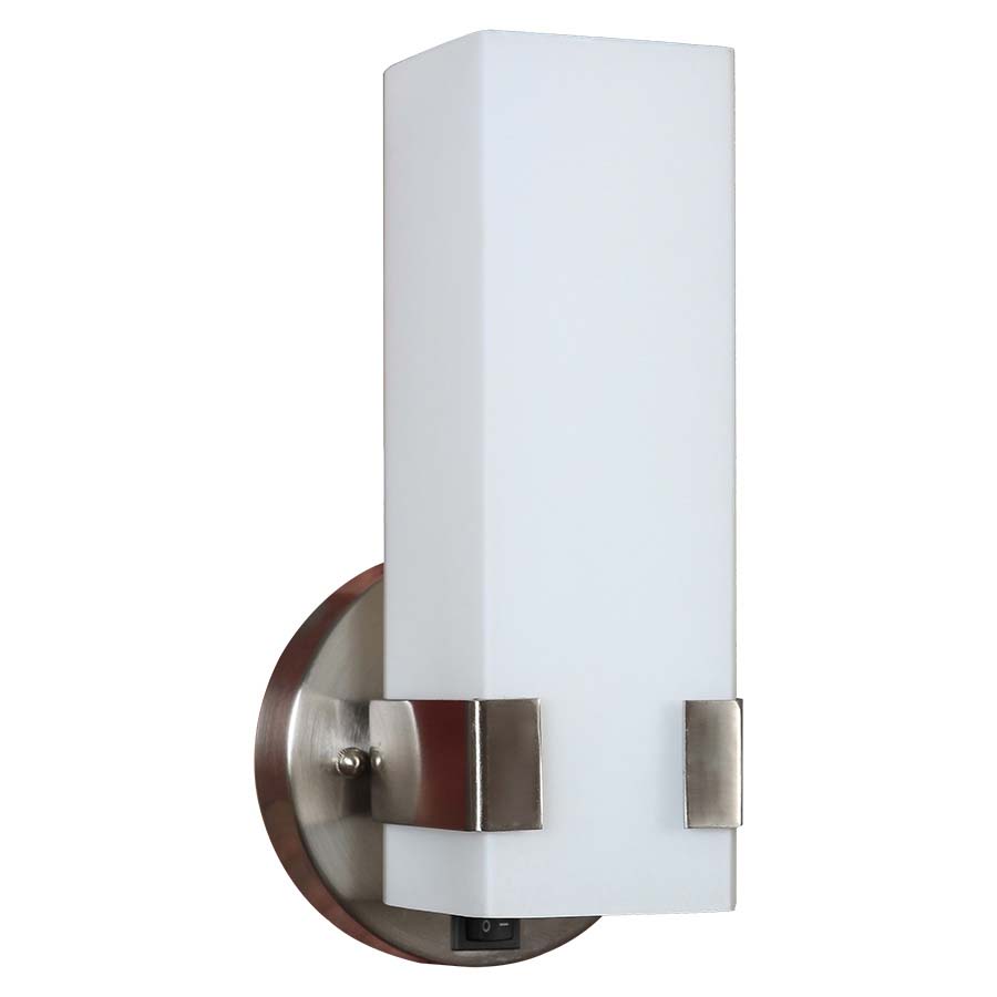 12.5" Brushed Nickel Vanity Fixture, Rectangular Frosted White Glass Diffuser. On/off rocker switch at back plate. 12' Silver 45° cord that exits out of the back of the fixture. Recommend one 6 watt LED Quad PL style bulb with GU24 socket.