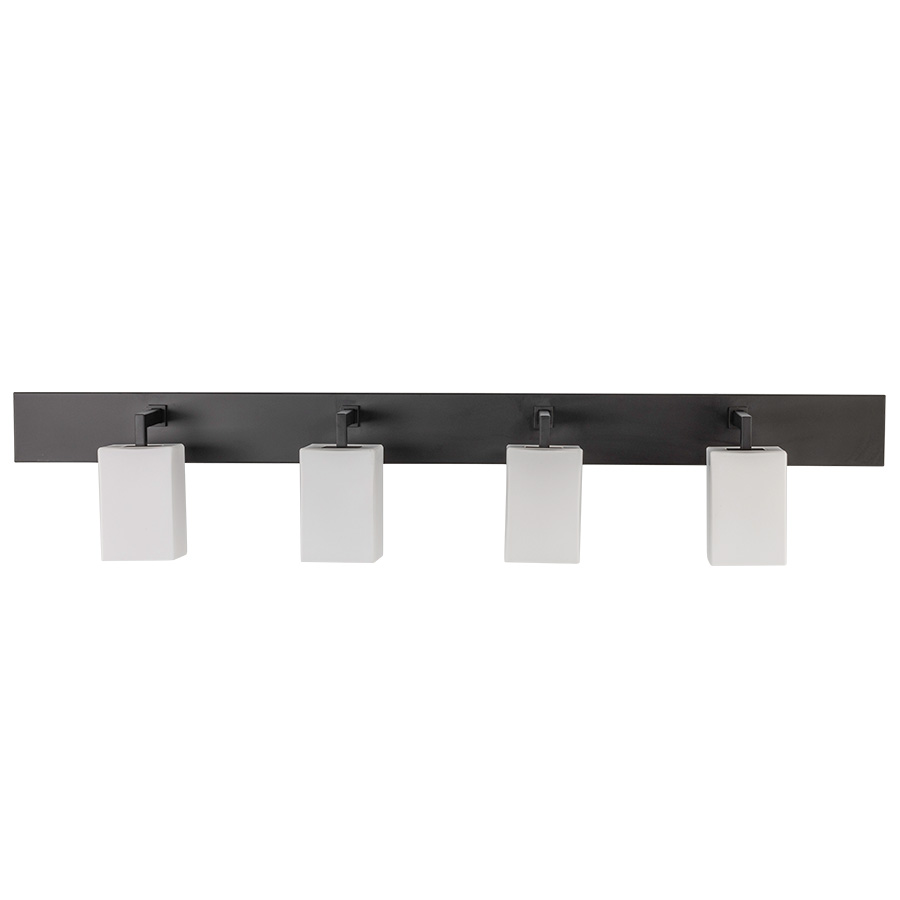 48" Matte Black Vanity Fixture, 8.5" High, with Frosted White Glass Diffusers. Direct wired, 4 medium base sockets. Recommend four 1100 lumen LED bulbs.
