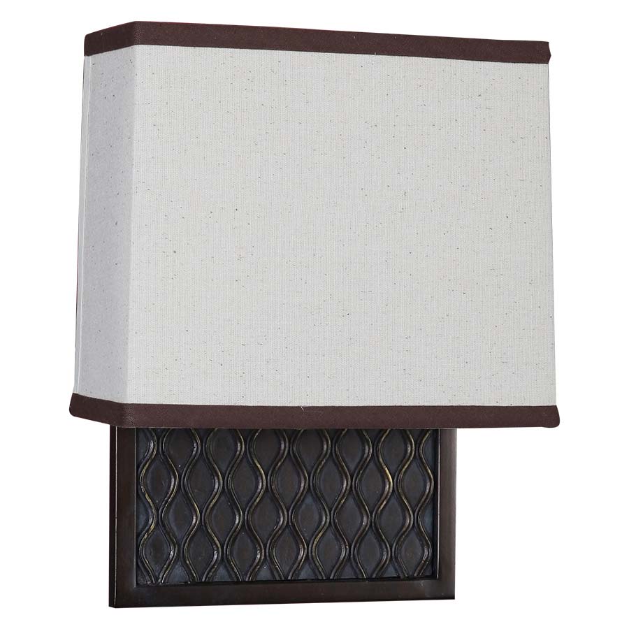 Portland Bronze Wall Sconce, 9" W, 11.5" H, with 3.5"x8.5"x4"x9"x7.5" Natural Specked Linen with brown trim Shade. Recommend one 23 watt GU24 self-ballasted spiral bulb.(bulb not included)
