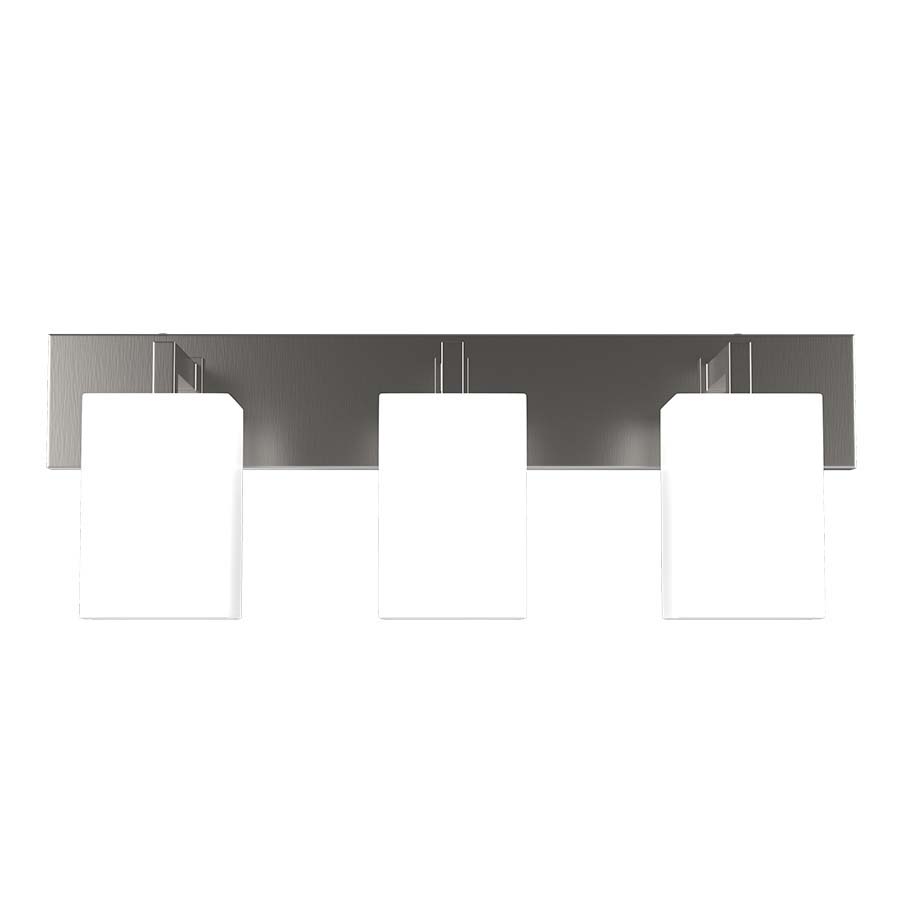Bathroom vanity lights diffuse flattering light above a mirror. This square bathroom light fixture in brushed nickel has three white frosted glass shades.