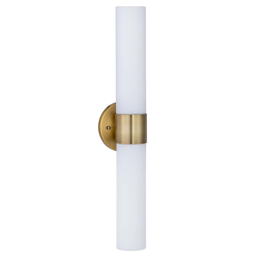 24"H Brushed Brass 2-Light Wall Sconce, Two GU24 sockets, Direct Wired with Opal Glass Diffusers. Recommend two 8 watt PL or 11 Watt LED PL bulbs with GU24 base.