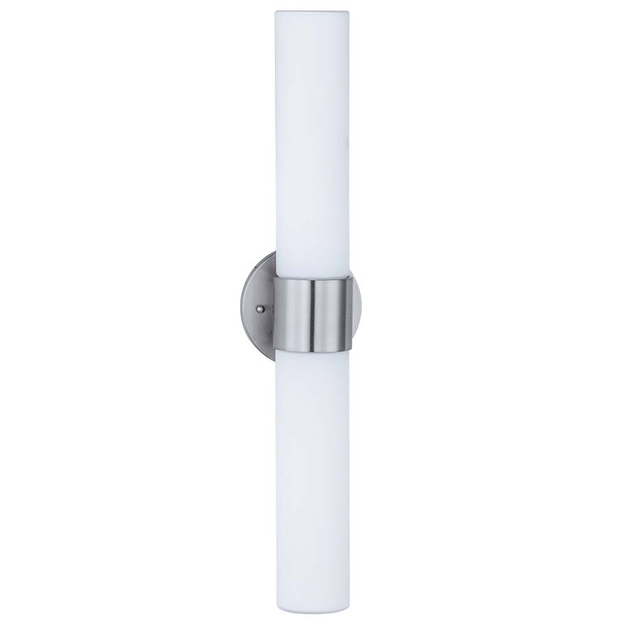 24"H Brushed Nickel 2-Light Wall Sconce, two GU24 sockets, Direct Wired with Opal Glass Diffusers. Recommend two 8 watt PL or 11 Watt LED PL bulbs with GU24 base. (Alt. # 3917C)