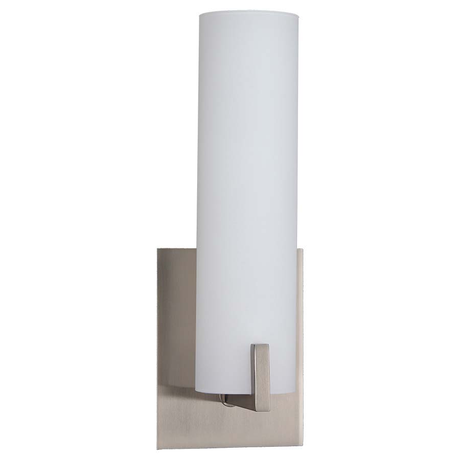 Brighten up guest rooms with Arkansas Lighting's 14"H Brushed Nickel Cylindrical Hotel Wall Sconce with frosted white acrylic diffuser.