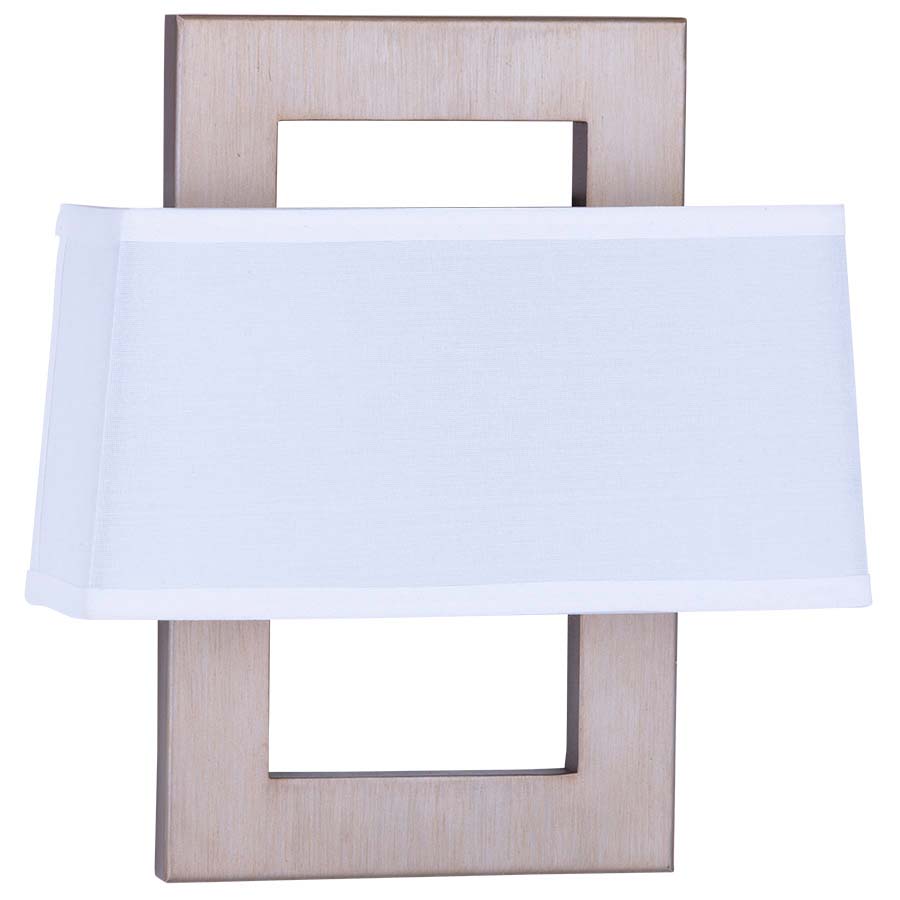 13"H, 12"W, 4"D Antique Silver Wall Sconce, direct wired, Two medium base sockets, with 4"x11.5"x4"x12"x6" White Linen Hardback Half Shade. Recommend two 1100 lumen LED bulbs.