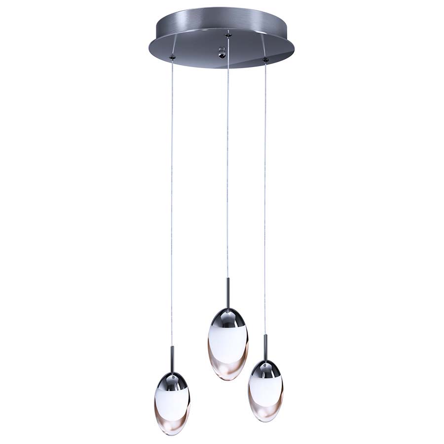 Polished Chrome LED 3-Light Pendant, integrated 650 lumens LED, Three 3 watts, 3000K, 80 CRI, direct wired, adjustable height to 59", Clear Acrylic Diffuser