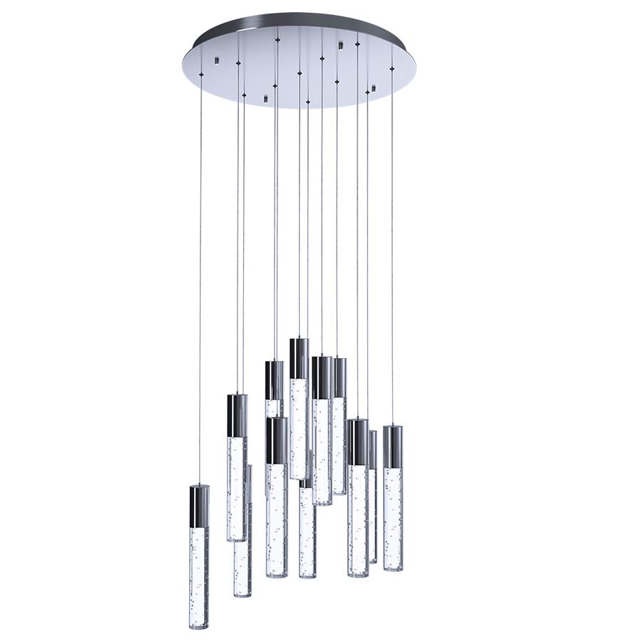 21.625" diameter 12-Light Polished Chrome Integrated LED Pendant, twelve 3 watt, 3600 lumen, 3000K, 90CRI, direct wired, with Clear Bubble Acrylic. Cord adjustable to 59" OAH.