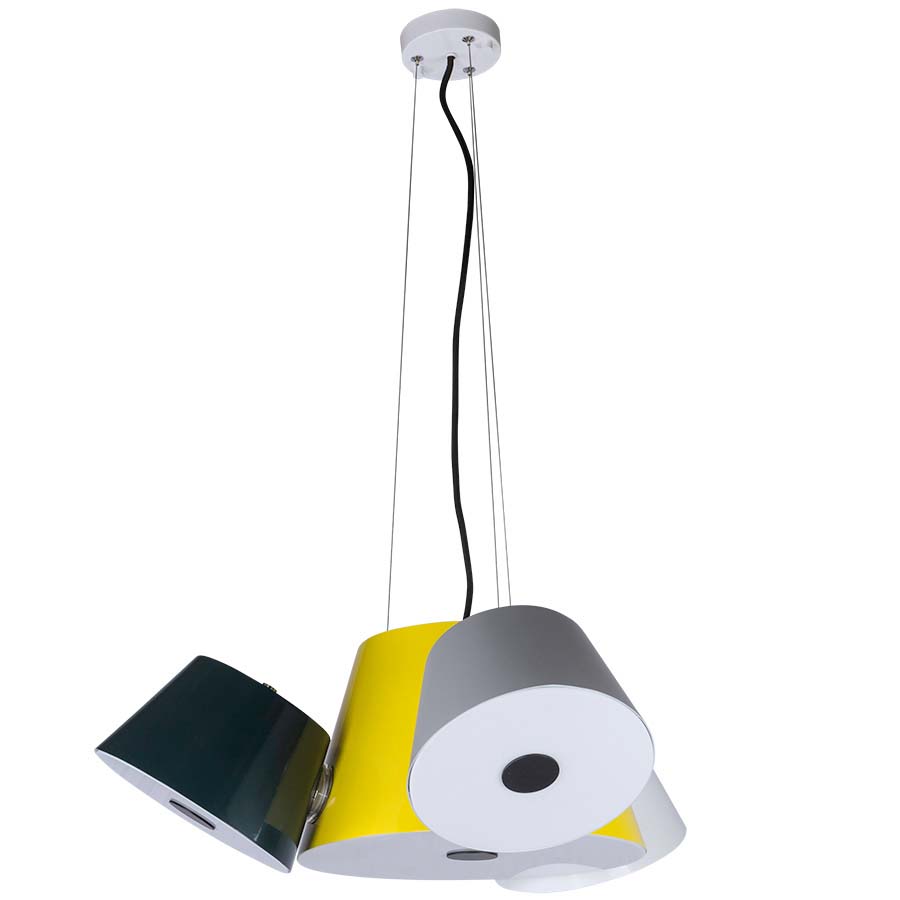4-Light Pendant Cluster with Metal Shades, medium skts, direct wired, Center is Pantone 611C, Outer are RAL 7030 Stone Gray, RAL 9010 Pure White, RAL 7012 Basalt Gray, Frosted White Acrylic bottom diffusers.Adjustable to 36"OAH.Recommend 1100 lumLED bulbs