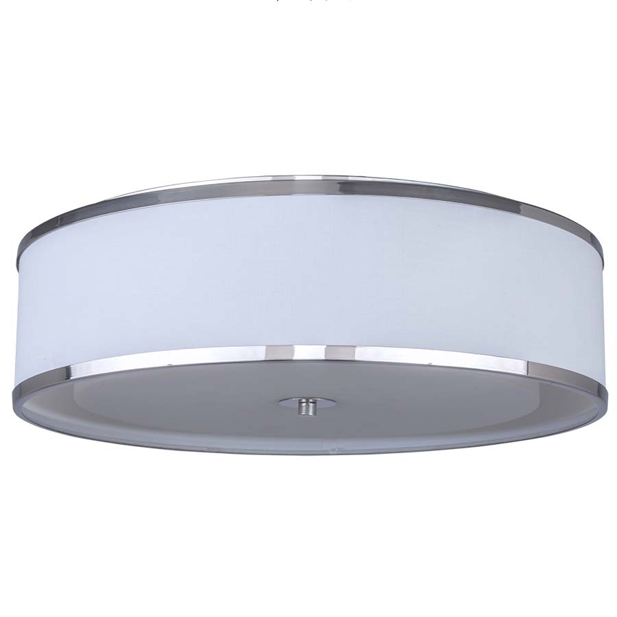 20" Ceiling Fixture with Polished Stainless Steel Trim, Cream Linen Hardback Outer Shade, Clear Frosted Acrylic Inner Shade. three medium base sockets, Direct Wired, Recommend three 800 lumen LED bulbs.
