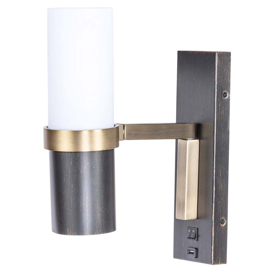 16"H Brushed Brass and Oil Rubbed Bronze Adjustable Wall Sconce, two GU24 sockets, direct wired, dual on/off rocker switch at back plate, one USB port, with Translucent White Acrylic Shade. Recommend two 13 watt CFL bulbs with GU24 base.
