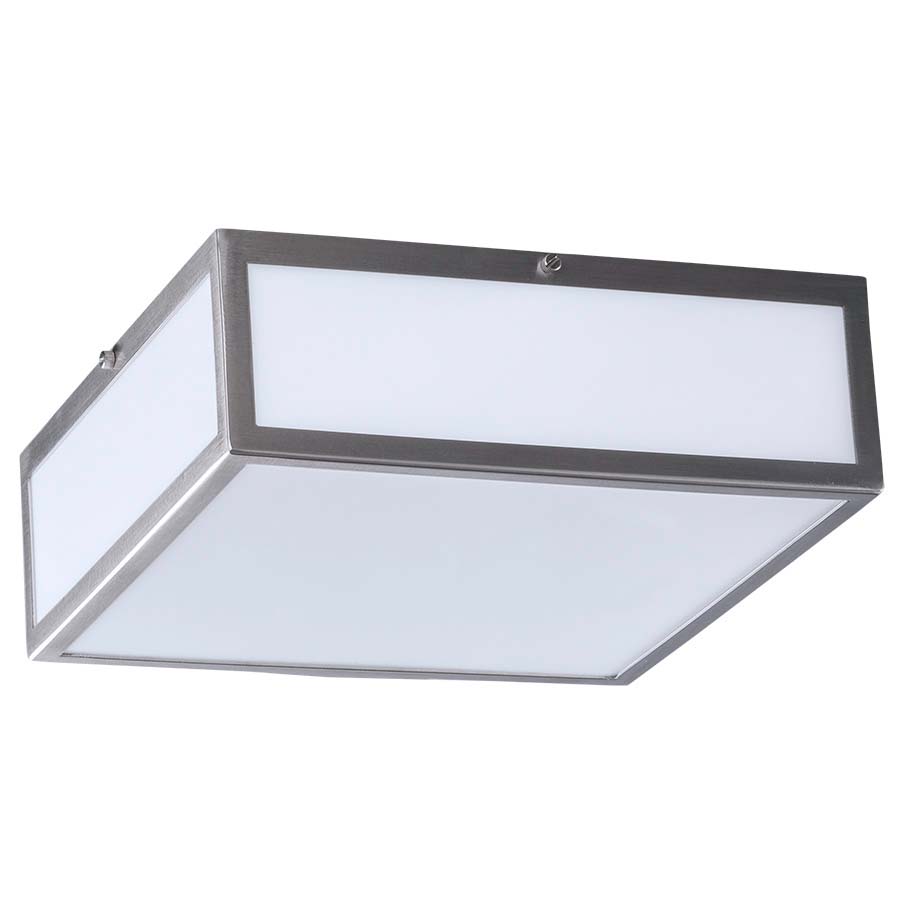 12" Square BRUSHED NICKEL Ceiling Fixture, two GU24 sockets, direct wired, with White Frosted acrylic diffuser. Recommend two 1100 lumen LED bulbs with GU24 base. 12"W, 12"H, 4"D.