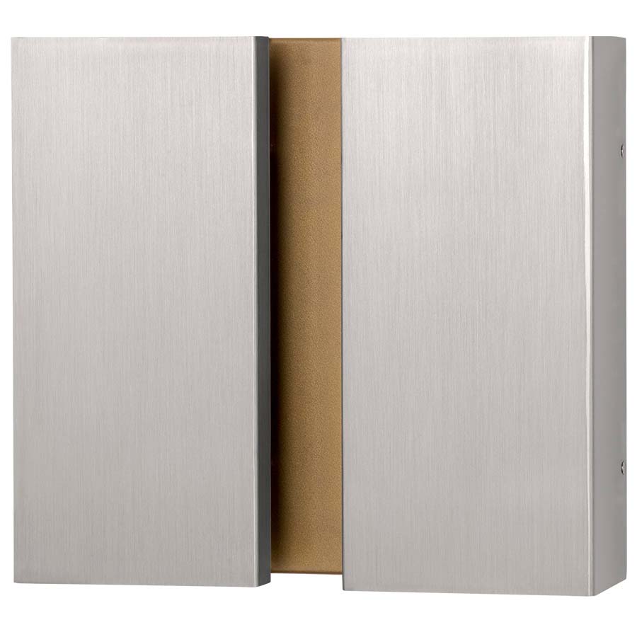 12"H Wall Sconce with BRUSHED NICKEL Exterior and Sungold Interior, two GU24 sockets, direct wired. Recommend two 1100 lumen LED bulbs with GU24 base. 13"W, 12"H, 3-7/8"D.