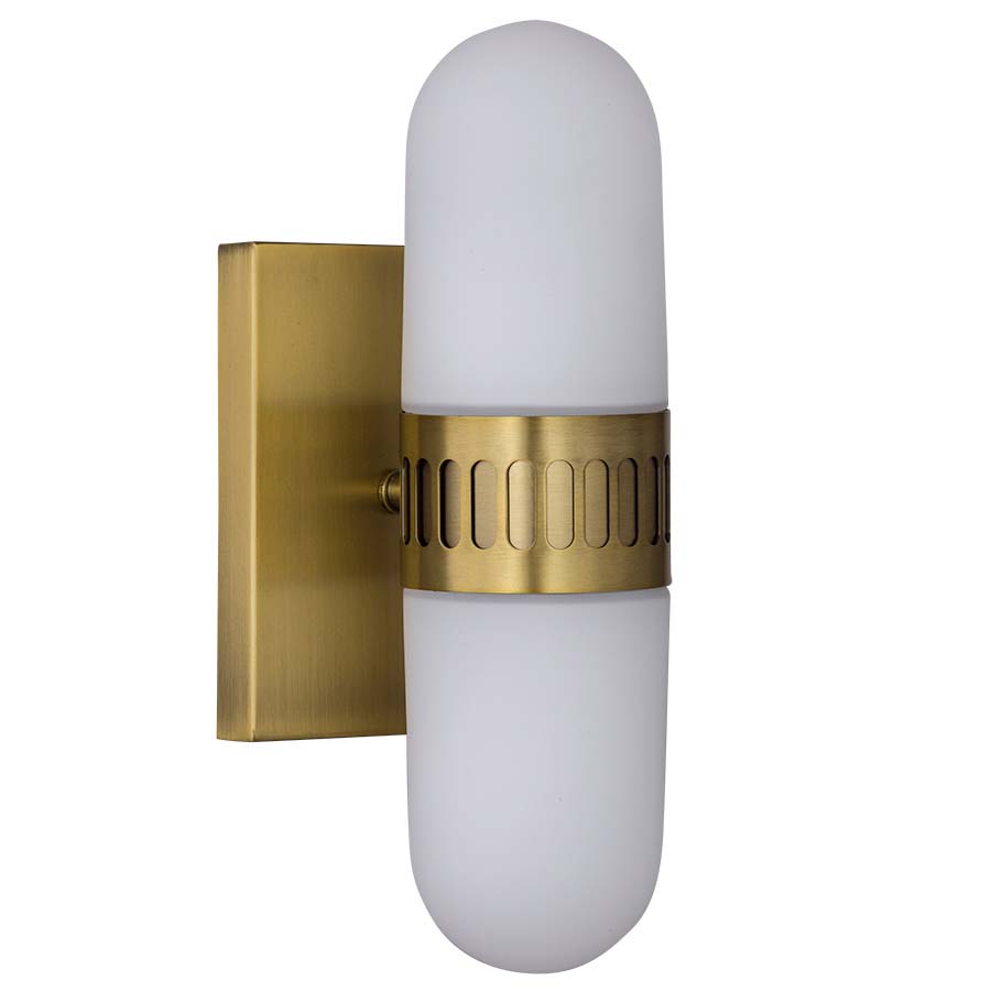 13" Brushed Brass Wall Sconce, two GU24 sockets, direct wired, with Opal White Glass Diffusers. Recommend two 800 lument LED bulbs with GU24 base.