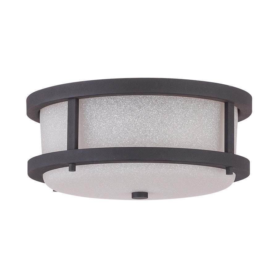 13.75"W Textured Black Outdoor Ceiling Fixture, two GU24 sockets, direct wired, Antique White Glass Shade, two 9.8 LED watt bulbs (bulbs included)