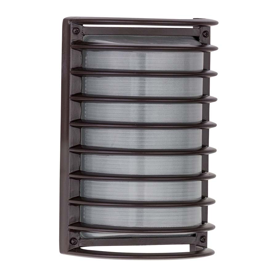 10"H Architectural Bronze Rectangular Caged Die Cast Bulkhead Outdoor Wall Sconce, medium base socket, direct wired, with Frosted Glass Diffuser. Recommend 1100 lumen LED bulb.