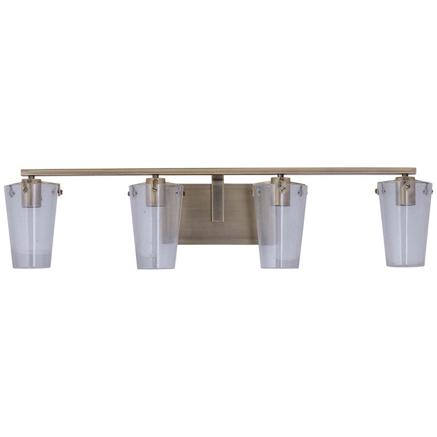 33.75" Natural Brass Vanity, four medium base sockets, direct wired, with clear seeded glass diffusers. Recommend four 1100 lumen LED bulbs.
