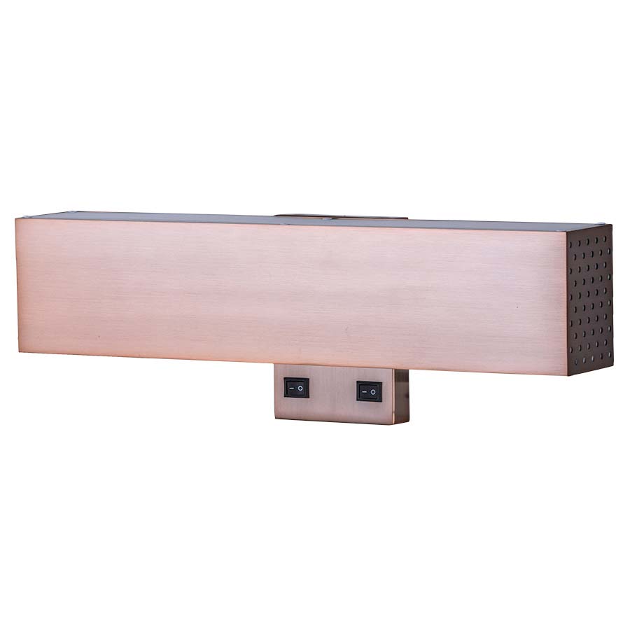 18"W Oiled Bronze Aluminum Wall Sconce, 2-medium base sockets, 2- on/off rocker switches, 8' Silver 45° cord exiting out back, metal shade with perforated sides, white frosted acrylic top and side diffusers. Rec two 1100 lumen LED bulbs. 6"H, 4"D