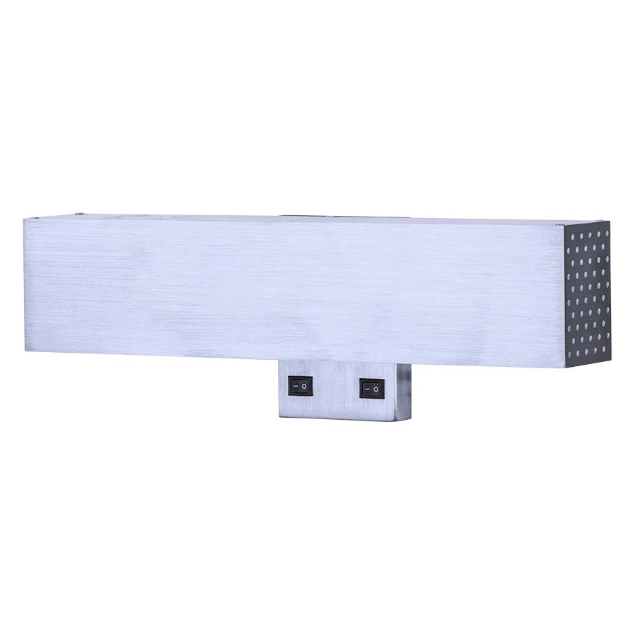 18"W Satin Brushed Smoke Aluminum Wall Sconce, 2-medium base sockets, 2- on/off rocker switches, 8' Silver 45° cord exiting out back, metal shade with perforated sides, white frosted acrylic top and side diffusers. Rec two 1100 lumen LED bulbs. 6"H, 4"D