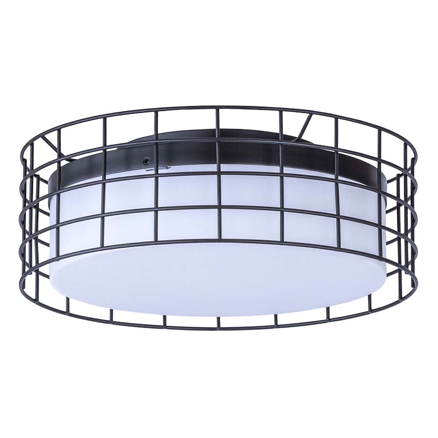 A cage surrounds an acrylic diffuser in this modern ceiling lamp by Arkansas Lighting. The ceiling mounted lighting fixture lends industrial vibes to a space.