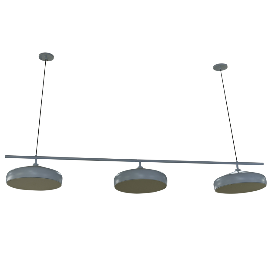 84"H x 98"L x 20"D Benjamin Moore Blue Hydrangea 2062-60 Matte Pendant, 3-Blue Hydrangea metal shades with medium base sockets and Frosted White Acrylic Bottom Diffusers, attached to a bar that is suspended from 2 adjustable black cords, adjustable up to 84"H, recommend three 5 watt B11 LED bulbs