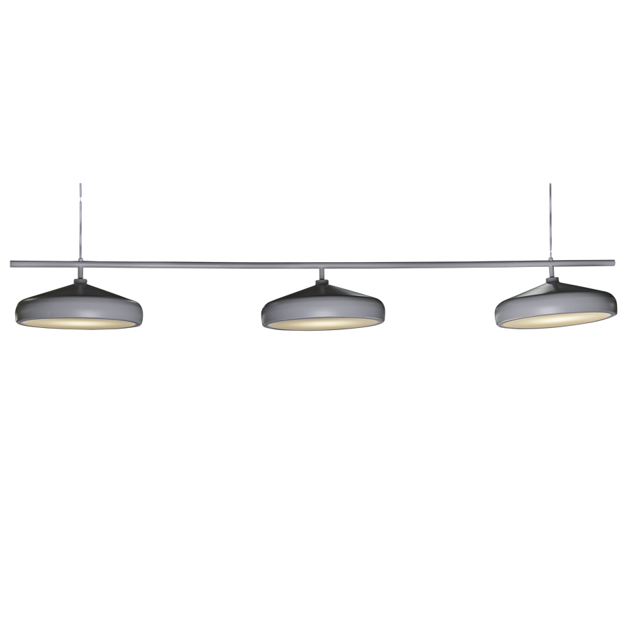 84"H x 98"Lx 20"D RAL 100 85 05 Celery White Pendant, 3-Celery White metal shades with medium base sockets and Frosted White Acrylic Bottom Diffusers, attached to a bar that is suspended from 2 adjustable black cords, adjustable up to 84"H, recommend three 5 watt B11 LED bulbs