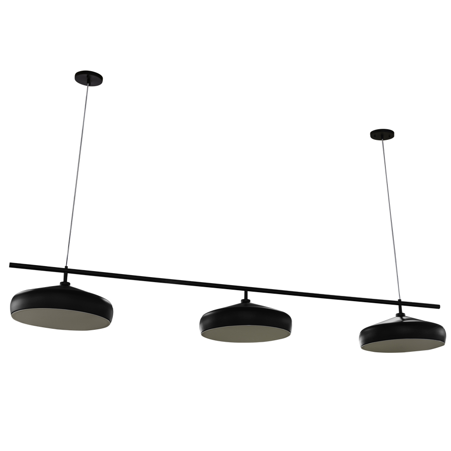 84"H x 98"L x 20"D RAL #9011 Graphite Black Matte Pendant, 3-Graphite Black Matte metal shades with medium base sockets and Frosted White Acrylic Bottom Diffusers, attached to a bar that is suspended from 2 adjustable black cords, adjustable up to 84"H, recommend three 5 watt B11 LED bulbs