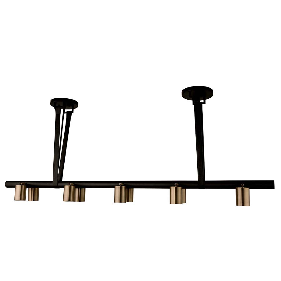 72"W Aged Iron and Antique Brass Integrated LED Pendant, ten 10 watt LED, 8000 lumen, 3000K, 90CRI, direct wired, with two vinyl straps, ten Antique Brass metal shades.