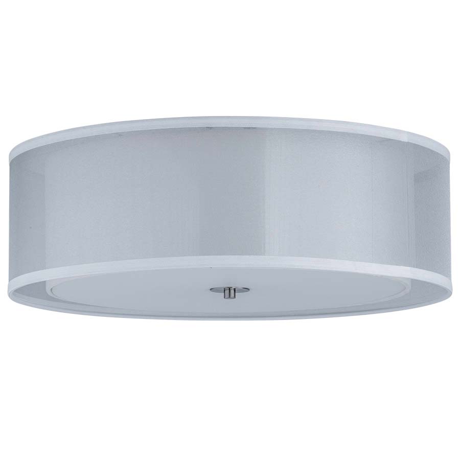 22" diameter Ceiling Fixture, three medium base sockets, 22"x22"x7" Silver Organza Outer Shade with 18"x18"x6.5" Cream Linen Inner Shade, Brushed Nickel accents, direct wired, Frosted White bottom diffuser. Recommend three 1100 lumen LED bulbs