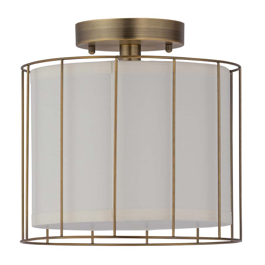 Metal accents encircle a cream linen hardback shade in this elegant antique brass pendant light. Shop more flush mount lighting from Arkansas Lighting now.