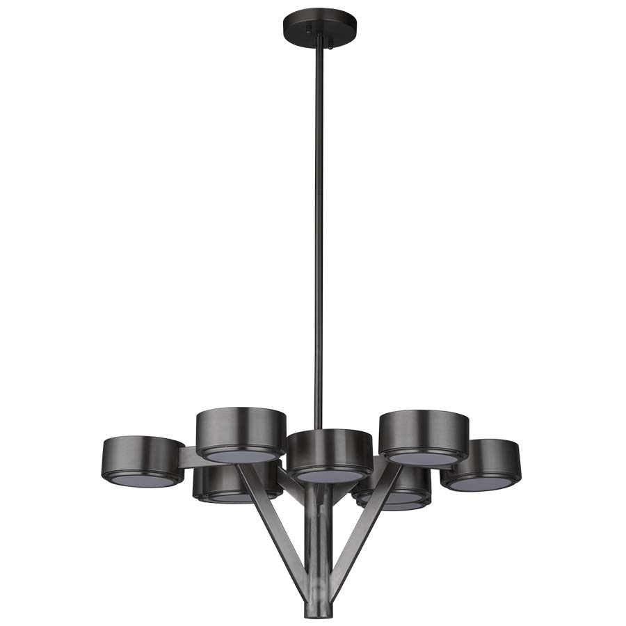 30" diameter Brushed Nickel Pendant, nine E12 sockets, direct wired, two 12" and one 6" down rods, with nine 6" diameter Brushed Nickel Metal Shades with White Frosted Acrylic diffusers, recommend nine 5 watt Candelabra LED bulbs