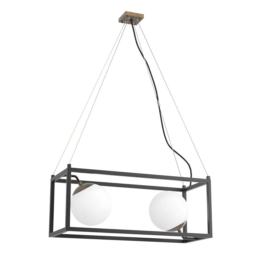 36"W Matte Black Frame and Canopy with Antique Brass Accents Two Light Pendant, direct wired, Black Cord, adjustable up to 60"H, White Frosted Acrylic Globes, recommend two 1100 lumen LED bulbs.
