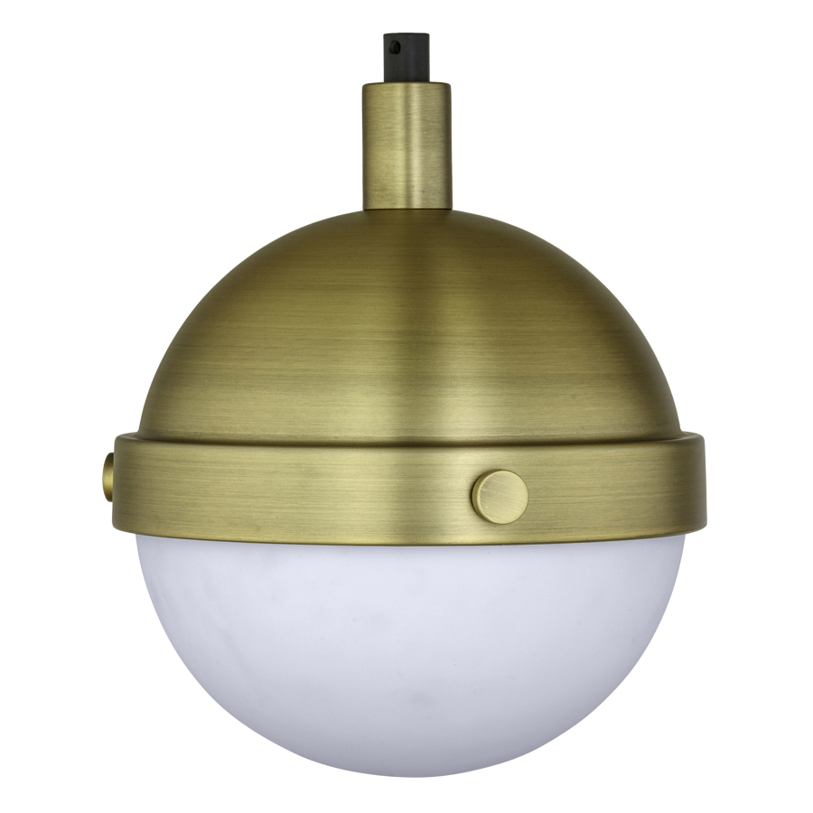 9" diameter Matte Black and Antique Brushed Brass Pendant, medium base socket, direct wired, 24" Black Cord, 37-1/8" overall height, White Frosted Acrylic Globe