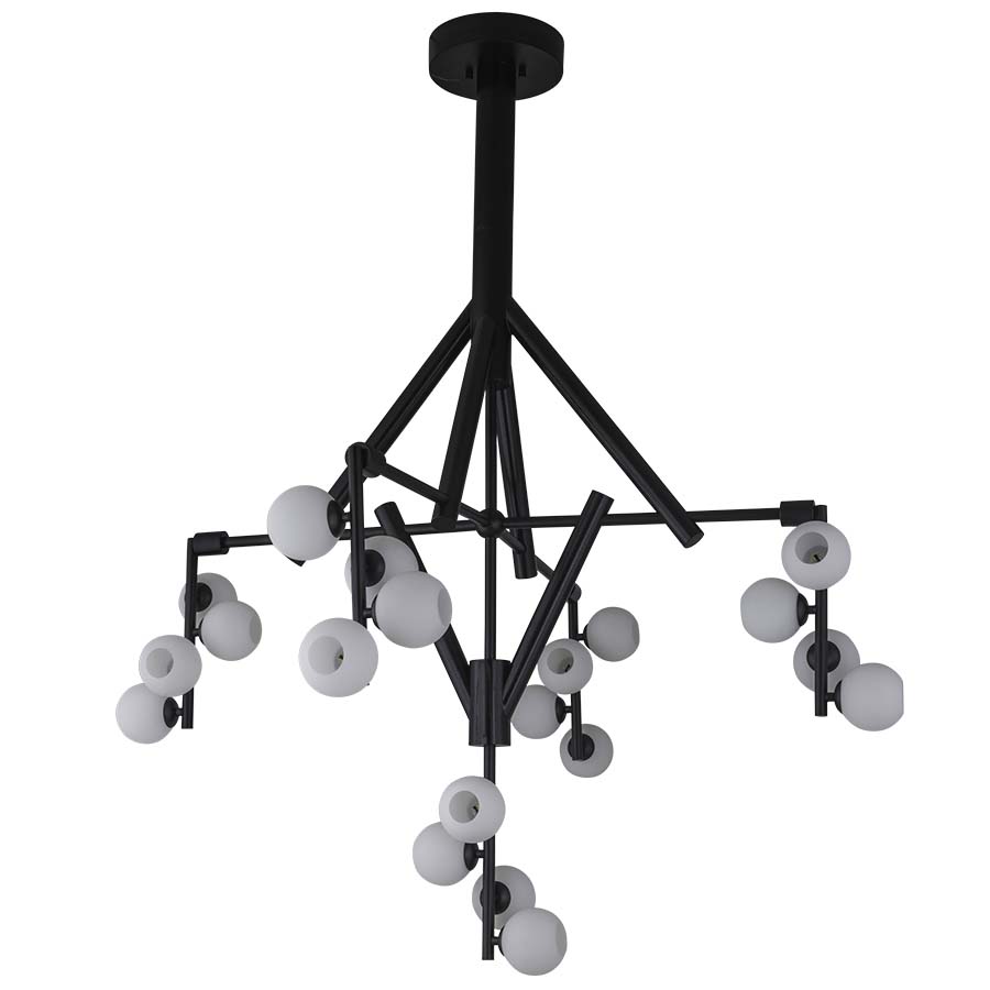 50" diameter Matte Black and Ebony Wood 20-Light Pendant, twenty G9 sockets, direct wired, 60" overall height, with twenty 3-7/8" diameter Milk White Glass Globes, recommend twenty 4 watt G9 LED bulbs