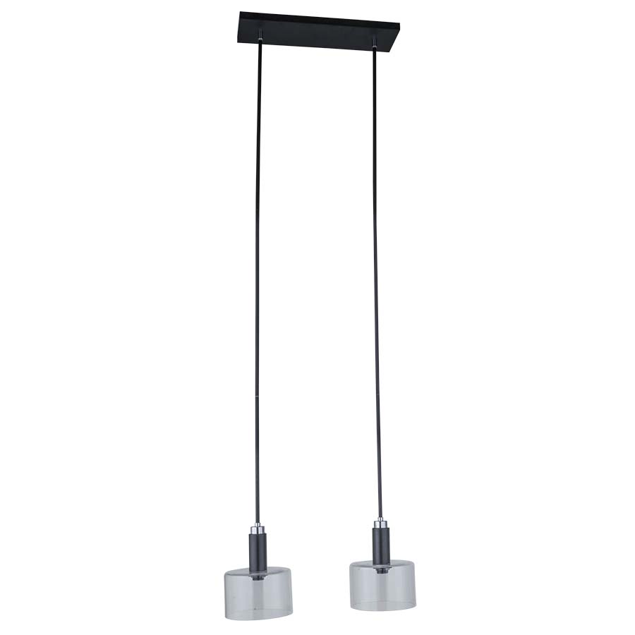 22"W Matte Black and Polished Chrome Two Light Pendant, two medium base sockets, direct wired, with two Clear Glass Shades, Recommend two 8 watt Clear Glass LED bulbs