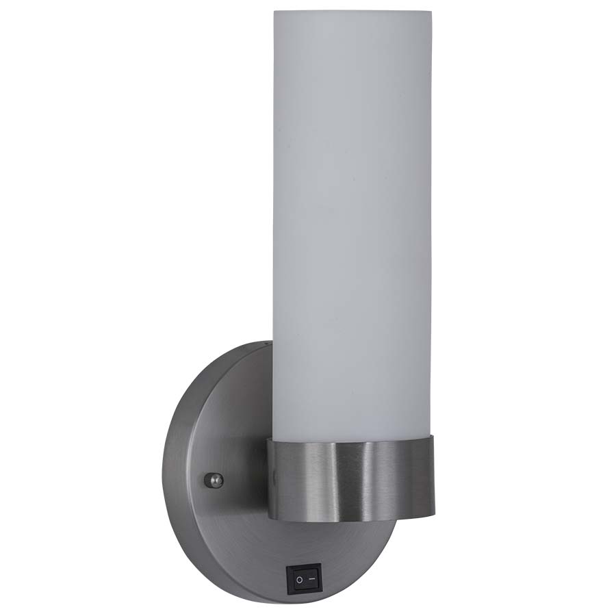 12" Brushed Nickel Wall Sconce, GU24 socket, on/off rocker switch at backplate, 12' Silver 45° cord exiting out back of lamp, with White Frosted Acrylic Diffuser, recommend 6 watt PL style LED bulb