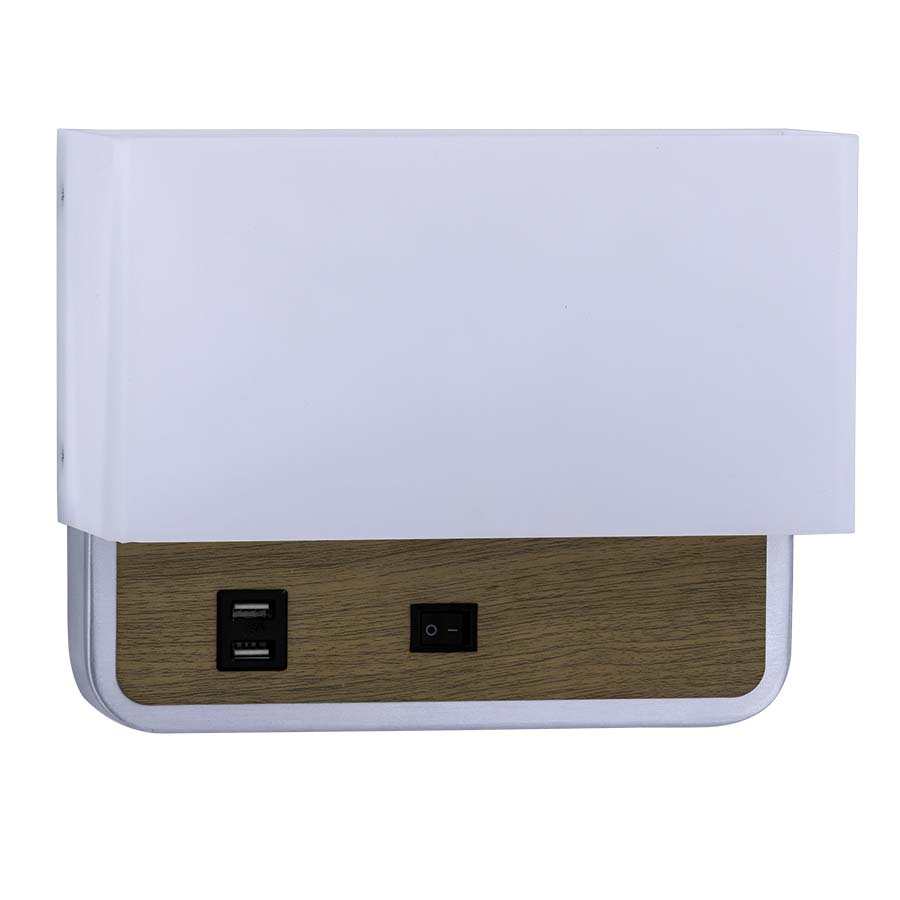 7.25"H Brushed Aluminum and Wood finish to match Formica 5883-58 Pecan Woodline Wall Sconce, GU24 socket, direct wired, on/off rocker switch at backplate, dual USB port, with White Frosted Acrylic Shade, recommend 800 lumen LED bulb with GU24 base