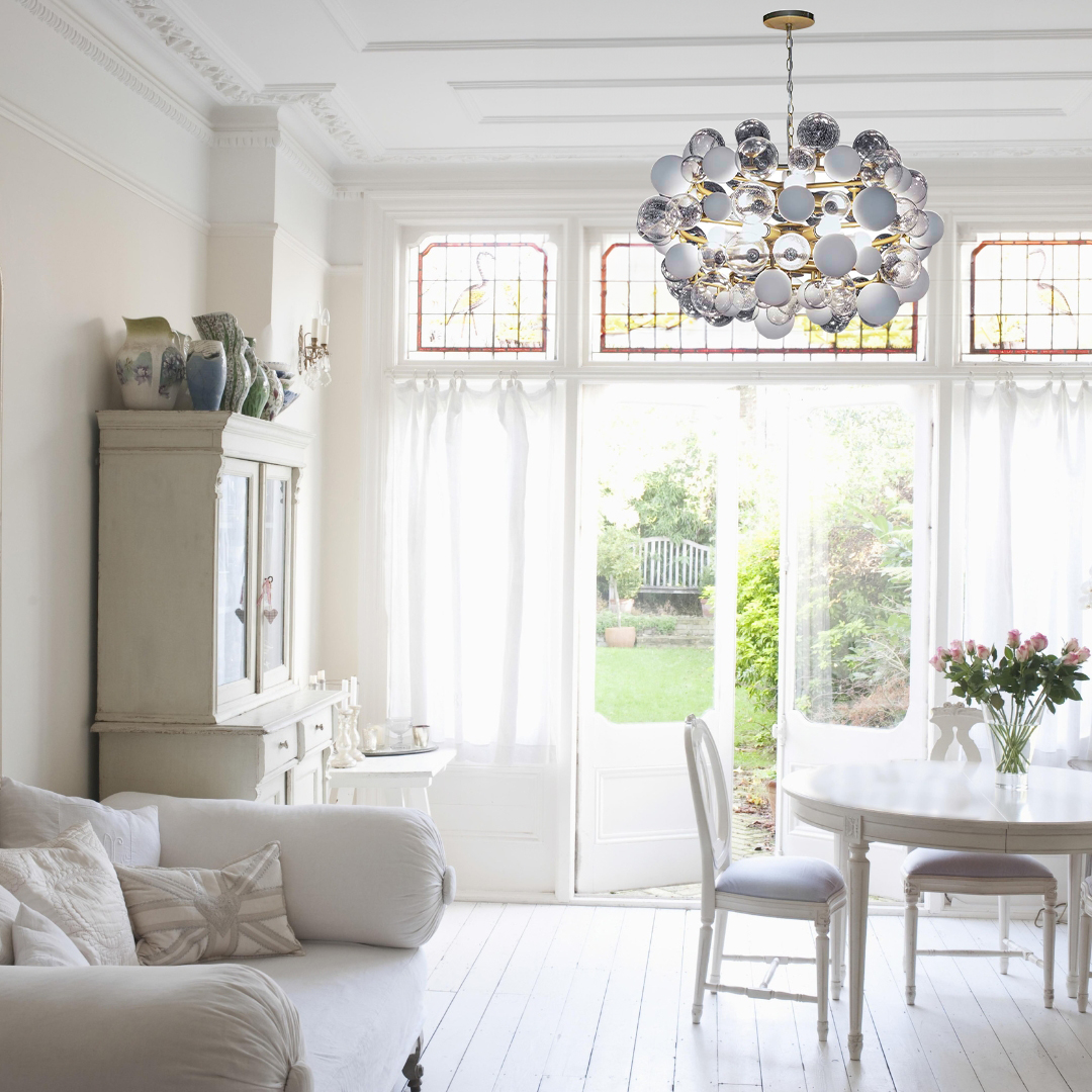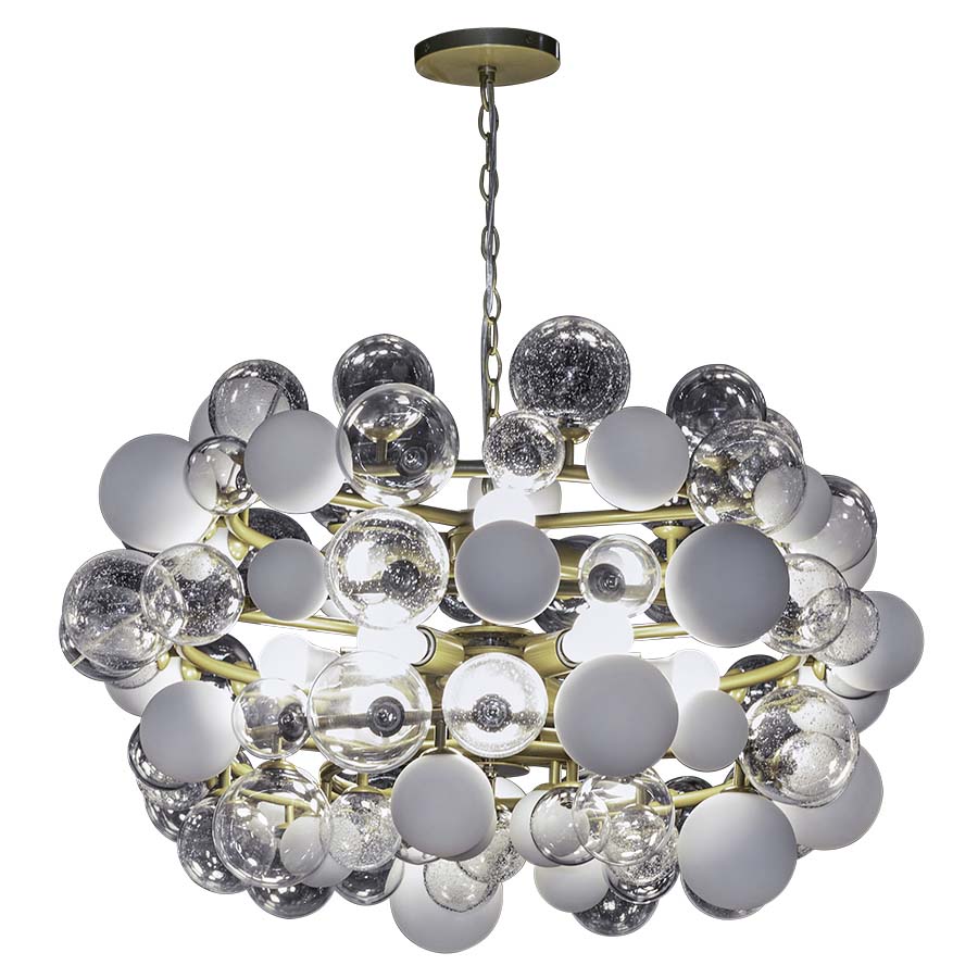 36" diameter Brushed Brass Pendant, twelve medium base sockets, direct wired, Brushed Brass Chain and Silver Cord hung, with 9-White Frosted Glass, 10-Clear Glass, and 9-Bubble Glass Globes, 36"OAH, recommend twelve 1100 lumen LED bulbs