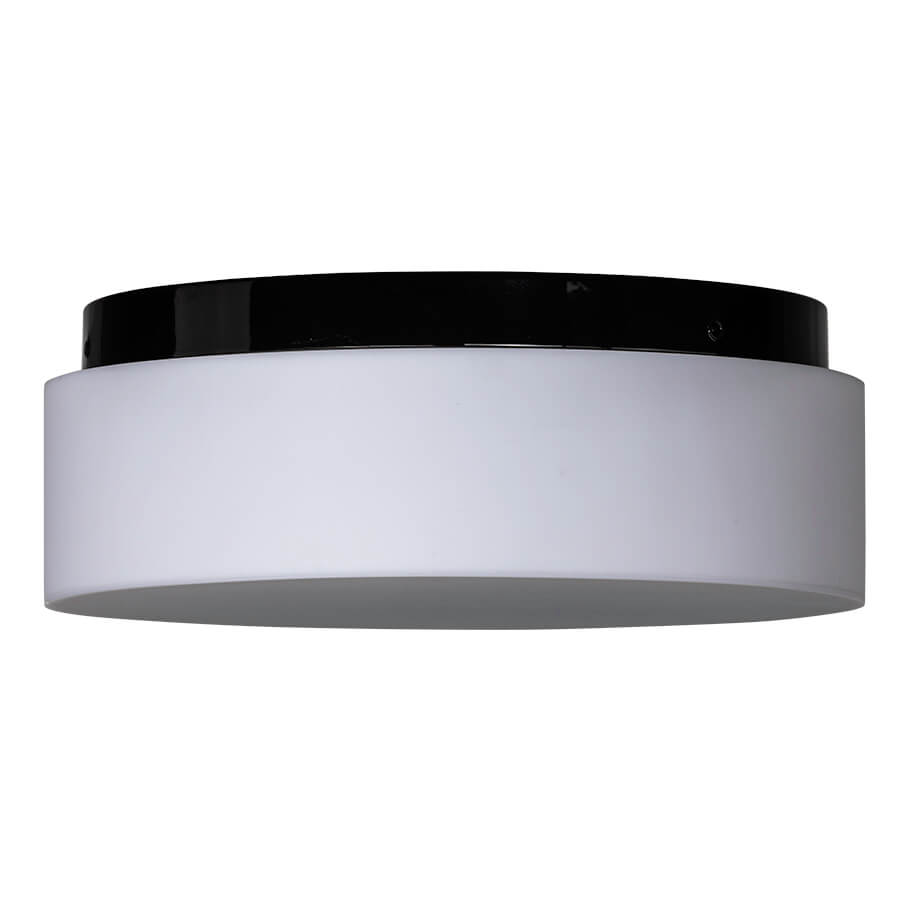 11" diameter Satin Black Aluminum Ceiling Fixture, two medium base sockets, direct wired, with White Frosted Acrylic Diffuser, recommend two 800 lumen LED bulbs