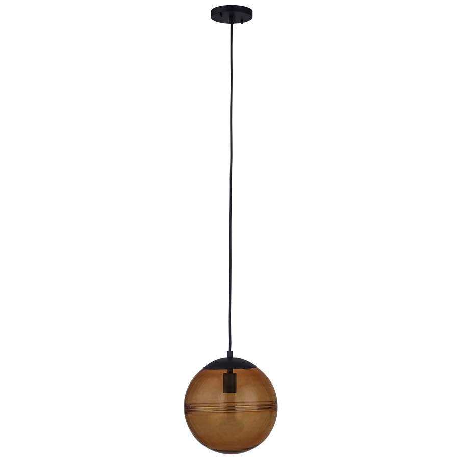 11" diameter Matte Black Pendant, medium base socket, direct wired, adjustable Black Fabric cord, with Brown Hand Blown Clear Glass, recommend 1100 lumen LED bulb
