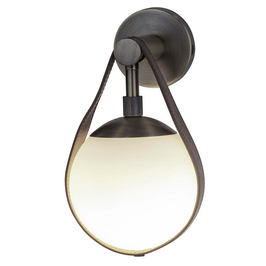 9"H Antique Brass Integrated LED Headboard Sconce, 5 watt LED, 500 lumen, 2700K, 90CRI, 120V AC, 10' Silver 45° cord exiting out back of lamp, all metal parts have extra clear lacquer coating, 5-1/8" diameter White Opal Matte Glass Globe, with faux leather strapping accent