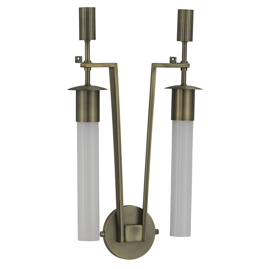 23.5"H Plated Brushed Brass Wall Sconce, two medium base sockets, direct wired, with Painted White Ribbed Glass, recommend two 3.5 watt Frosted T10 LED bulbs