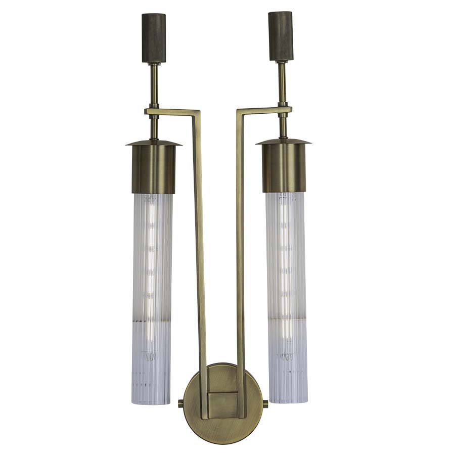 26.5"H Plated Brushed Brass Wall Sconce, two medium base sockets, direct wired, with Clear Ribbed Glass, recommend two 6.5 watt Clear T9 LED bulbs