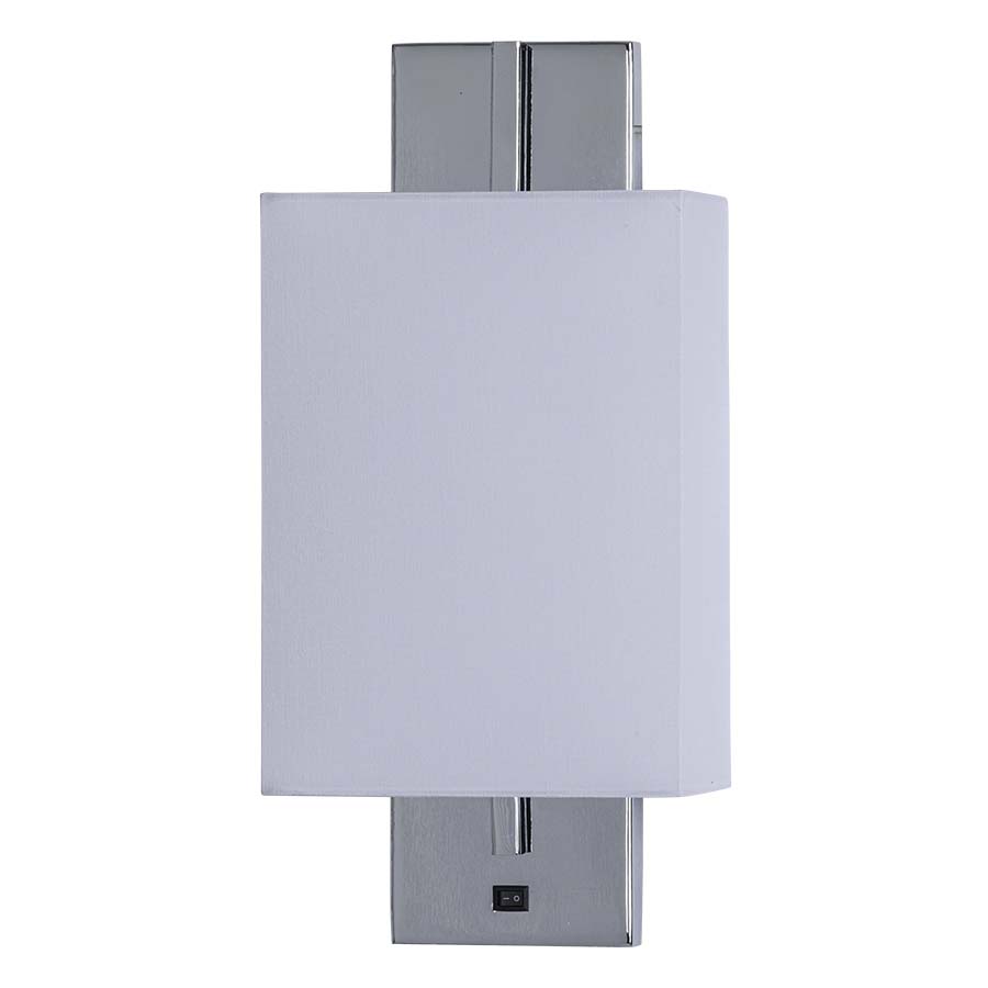 14-5/8"H Polished Chrome Wall Sconce, medium base socket, direct wired, on/off rocker switch at backplate, 4"x7"x4"x7"x9-5/8" White Linen Hardback Shade with Rolled Edges, recommend 4.5 watt T10 LED bulb