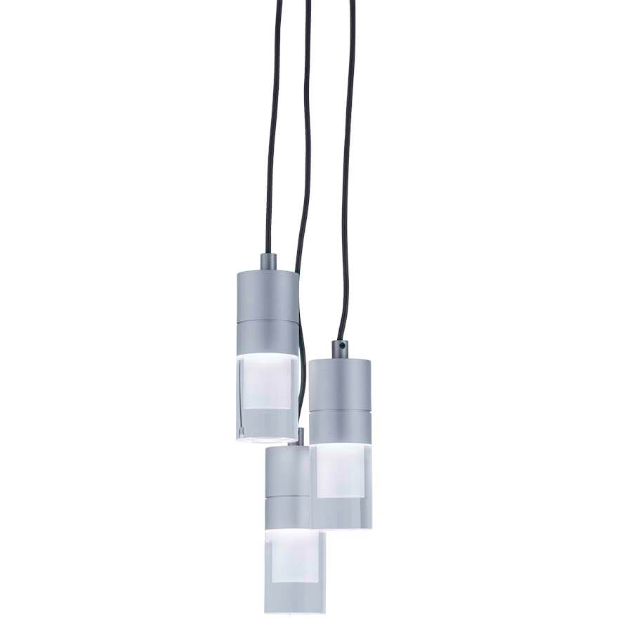 3-Light Metallic Silver Integrated LED Pendant, three 6 watt LED, 3000K, Direct Wired, three 2-3/8" diameter x 6.25"H Pendant heads with clear acrylic, three adjustable Black Cords, 150-7/8"OAH