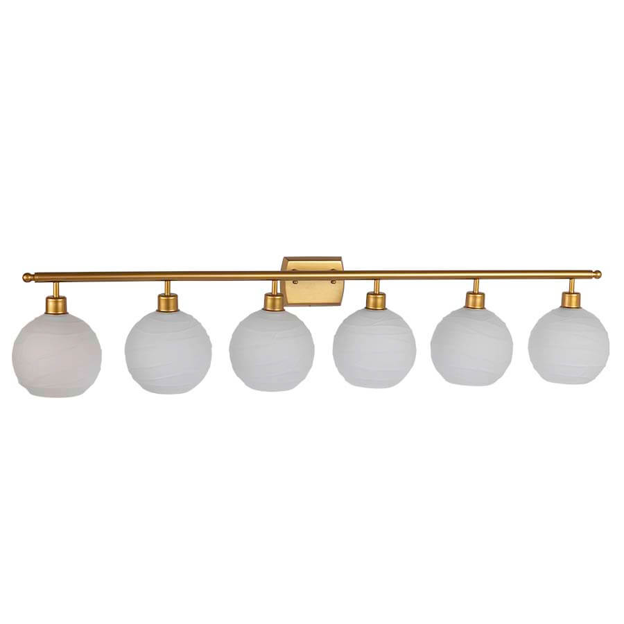 54"W Satin Gold Powder Coat Vanity, six medium base sockets, direct wired, with four Wavy Clear Frosted Glass Shades, recommend six 1100 lumen LED bulbs